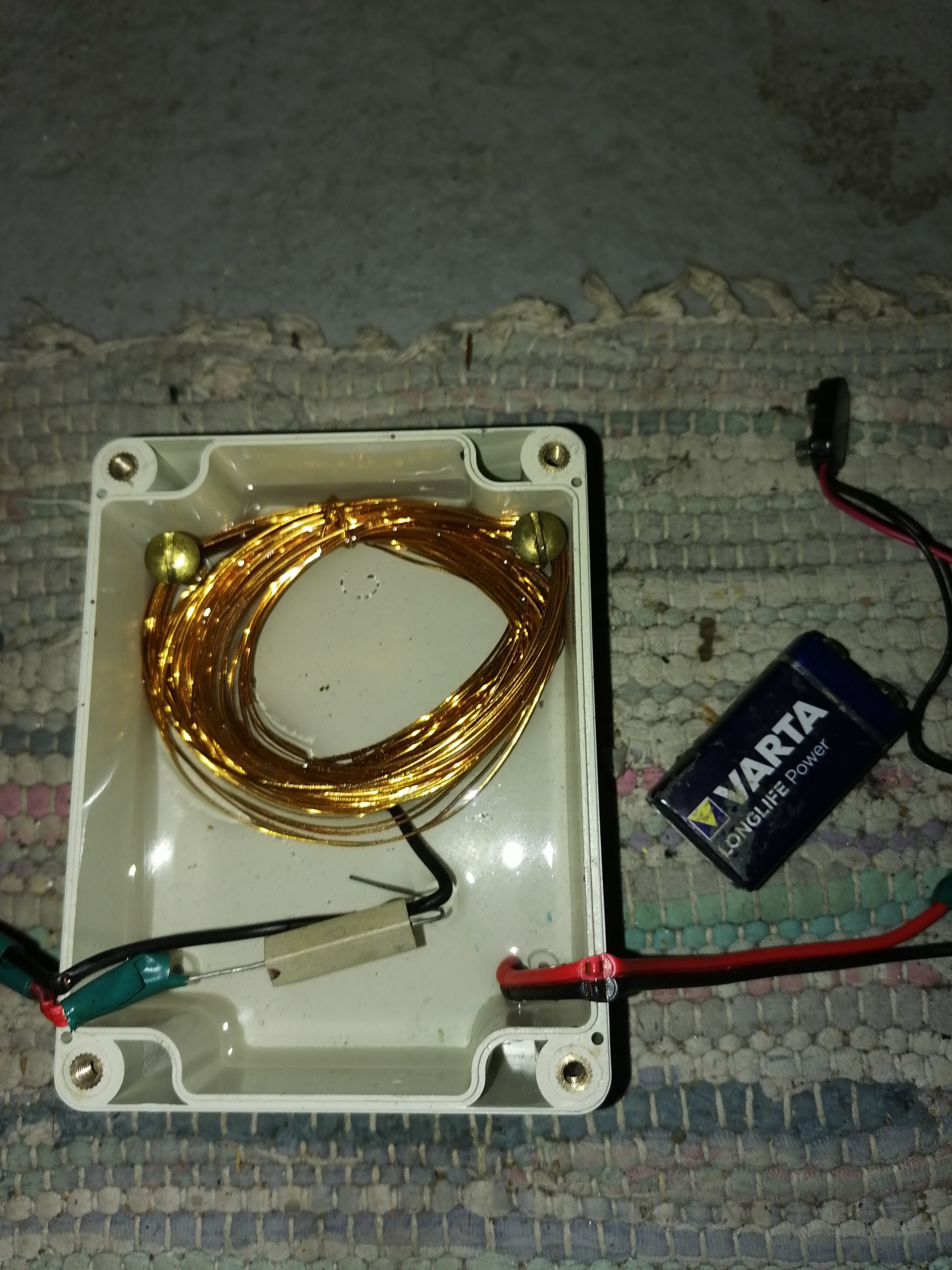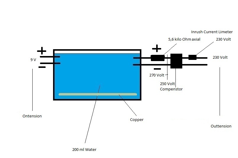 9 Volt machen Elektrolyse mit Wasser and Kupfer,das 270 Volt an 5,6 kilo Ohm axial. Für 250 Volt benötigen den Volt Drossler.